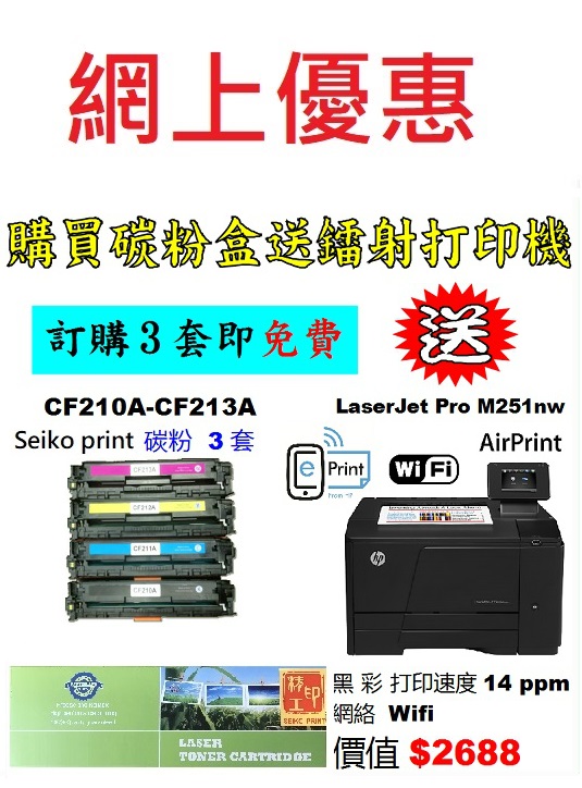 > 電腦週邊產品 > 送打印機優惠 > 買seiko print 碳粉送打印機 > 送HP打印機 > 特價-買碳粉送 HP M251nw 打印機優惠 - seiko print CF210A-CF213A 碳粉 3套特價-買碳粉送 HP M251nw 打印機優惠 - seiko print CF210A-CF213A 碳粉 3套(共12支)