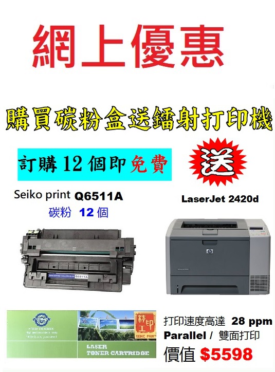 > 電腦週邊產品 > 送打印機優惠 > 買seiko print 碳粉送打印機 > 送HP打印機 > 特價-買碳粉送 HP 2420d 打印機優惠 - seiko print Q6511A 碳粉 12個特價-買碳粉送 HP 2420d 打印機優惠 - seiko print Q6511A 碳粉 12個