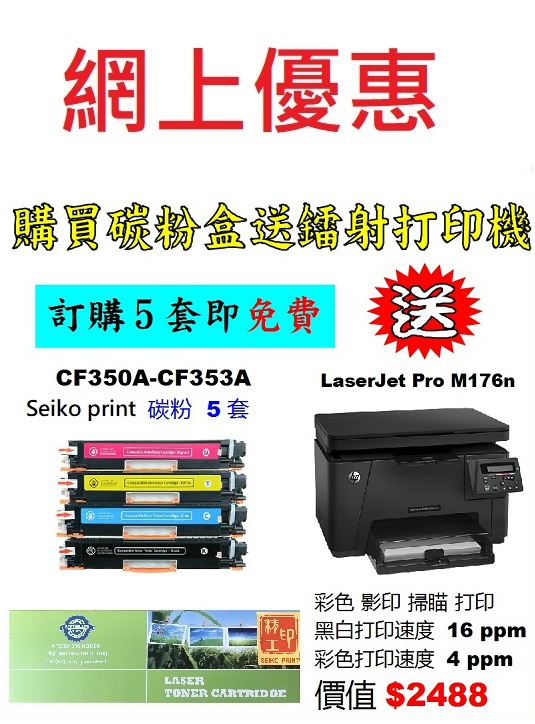 > 電腦週邊產品 > 送打印機優惠 > 買seiko print 碳粉送打印機 > 送HP打印機 > 特價-買碳粉送 HP M176n 打印機優惠 - seiko print CF350A-CF353A 碳粉 5套特價-買碳粉送 HP M176n 打印機優惠 - seiko print CF350A-CF353A 碳粉 5套(共20支)