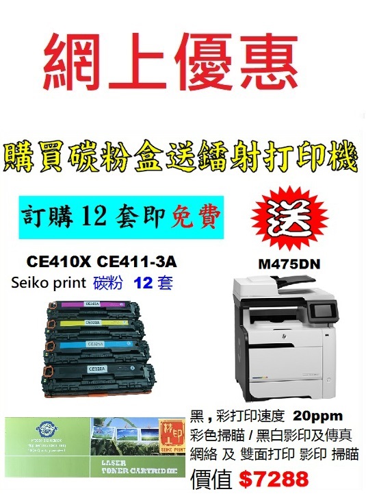 > 電腦週邊產品 > 送打印機優惠 > 買seiko print 碳粉送打印機 > 送HP打印機 > 特價-買碳粉送 HP M476dn 打印機優惠 - seiko print CE410X CE411-3A 碳粉 12套特價-買碳粉送 HP M476dn 打印機優惠 - seiko print CE410X CE411-3A 碳粉 12套(共48支)