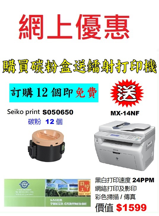 > 電腦週邊產品 > 送打印機優惠 > 買seiko print 碳粉送打印機 > 送EPSON打印機 > 特價-買碳粉送Epson MX14NF打印機優惠 - seiko print S050650 碳粉 12個特價-買碳粉送Epson MX14NF打印機優惠 - seiko print S050650 碳粉 12個