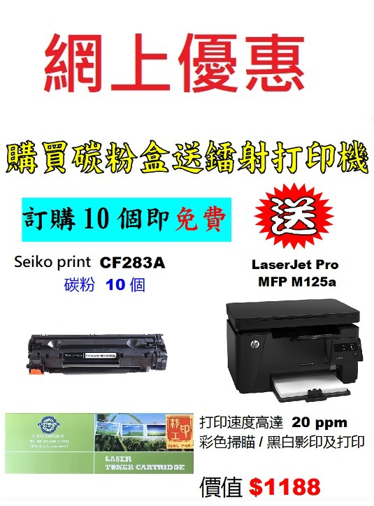 > 電腦週邊產品 > 送打印機優惠 > 買seiko print 碳粉送打印機 > 送HP打印機 > 特價-買碳粉送 HP M125a 打印機優惠 - seiko print CF283A 碳粉 10個特價-買碳粉送 HP M125a 打印機優惠 - seiko print CF283A 碳粉 10個